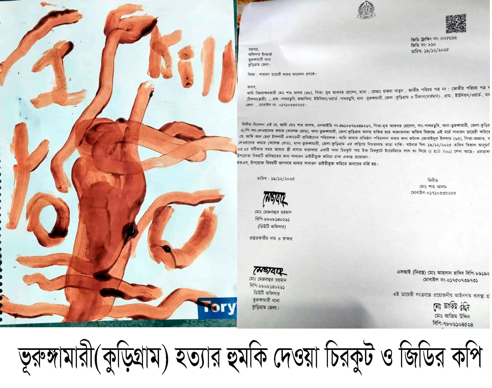 কুড়িগ্রামের ভূরুঙ্গামারীতে হত‍্যার হুমকি দিয়ে শাহ আলম নামে এক জামায়াত কর্মীর বাসার বেলকনিতে কে বা কারা একটি চিরকুট রেখে যায়। যেখানে একটি সাদা কাগজে রক্তমাখা একটি পুতুলের ছবির মাঝে ইংরেজিতে লেখা (I Kill You)। চিরকুট পেয়ে আতঙ্কিত হয়ে পড়ে ওই পরিবার।